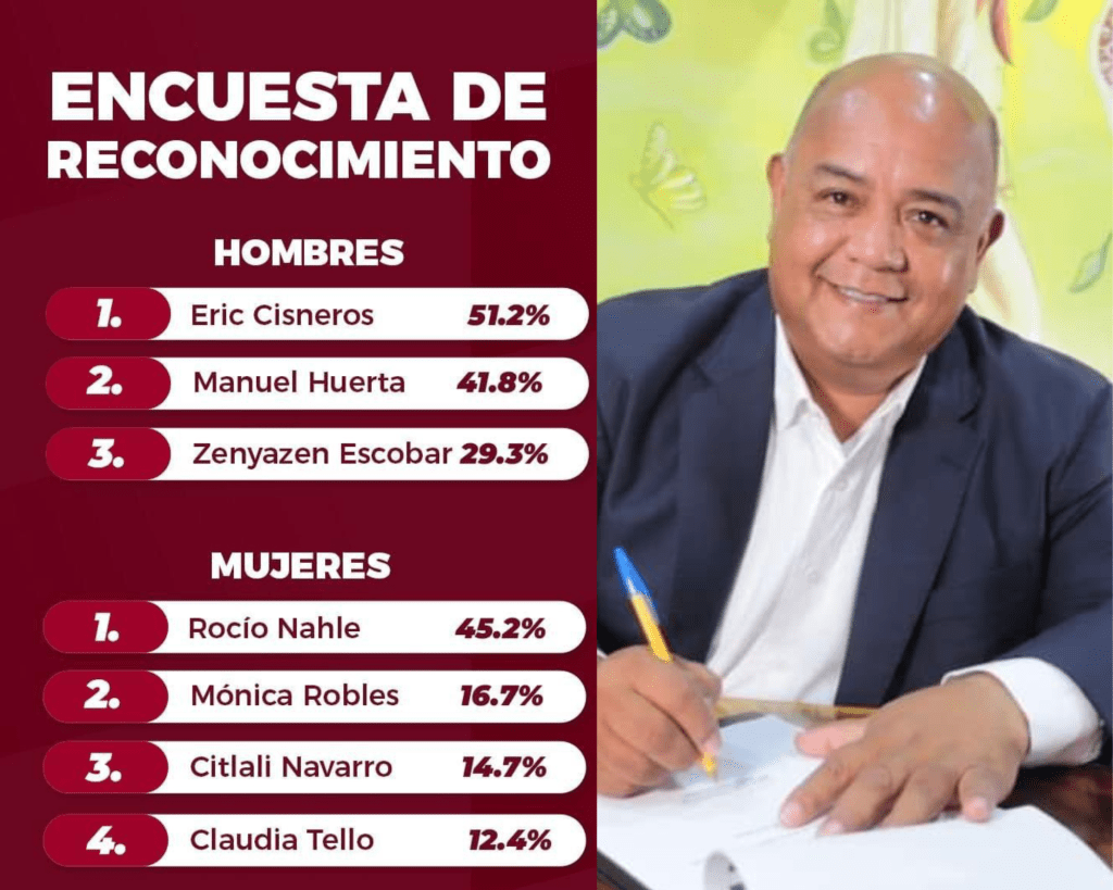 Eric Cisneros con 51%, 6 puntos arriba de Rocío Nahle que obtuvo el 45%; Manuel Huerta, 10 puntos abajo del puntero, con el 41%; y 22 puntos abajo Zenyazen Escobar García con 29%. Detrás están Mónica Robles, con 16%, Citlali Navarro 14%, y Claudia Tello, quién obtuvo el 12.4%.
