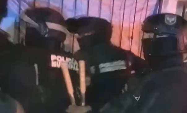 Tras estas acciones los presentes se hicieron de palabras mientras los oficiales forcejeaban e intentaban abrir la reja; luego de varios minutos retiran por la fuerza a una mujer y logran cortar los candados para salir y dar la orden de detener a todos.