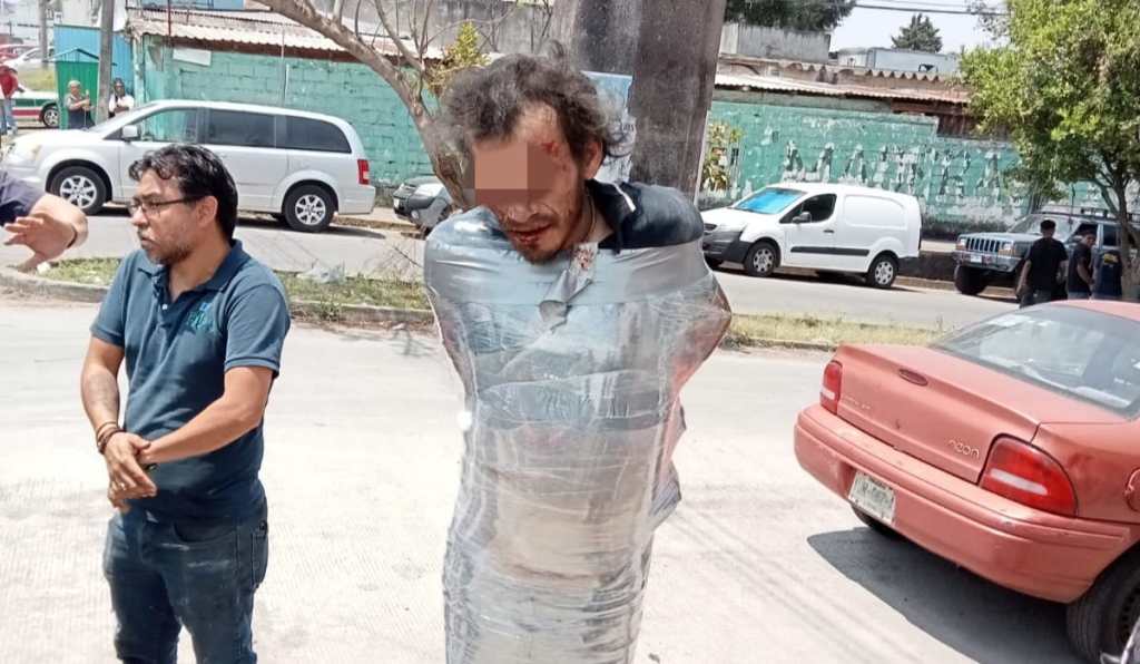 Entre varios lo sometieron, luego buscaron un poste y decidieron colocarlo en el tronco y acto seguido lo ataron y con una bolsa de plástico transparente le dieron vueltas a su cuerpo para mantenerlo bien sujeto con sus manos hacia atrás, además de haber quedado despeinado al tratar de huir.