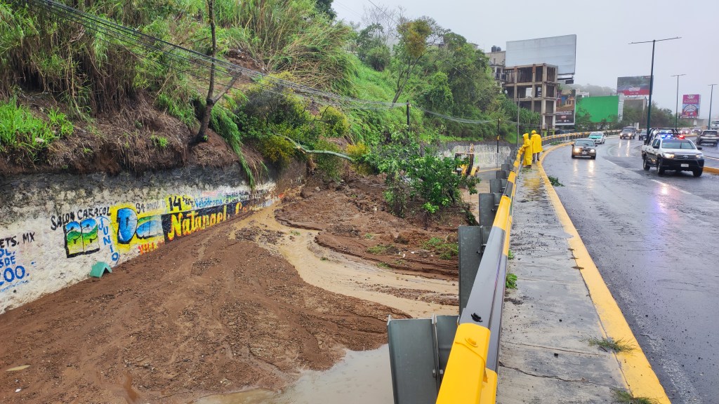Xalapa, Ver.- Un deslave provocó el cierre de la lateral del Puente Macuiltépetl, lo cual afectó a la circulación vial en la zona del Bulevar Xalapa-Banderilla, a pocos metros de las oficinas centrales de la Secretaría de Finanzas.